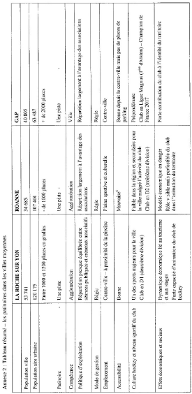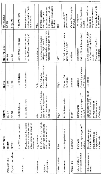Les effets induits par la présence d’une patinoire et d’un club de hockey sur un territoire dépendent ainsi de différentes variables qui peuvent être sportives, géographiques ou encore sociohistoriques et socioculturelles. Leur compréhension trouve avant tout sa force explicative dans la singularité des contextes locaux (voir tableaux 1, 2 et 3 en annexe), par ailleurs évolutifs. Le niveau de l’équipe de hockey, le mode de gestion de la patinoire, son emplacement ou sa politique d’exploitation sont autant de critères qui peuvent influencer les retombées économiques et les effets sociaux que l’équipement génèrera sur le territoire. Il faut alors souligner que ces différentes variables sont déterminées par des choix politiques, eux-mêmes influencés par les représentations et les relations sociales qu’entretiennent les décideurs publics au sein de leur organisation (Dubois, 2010).